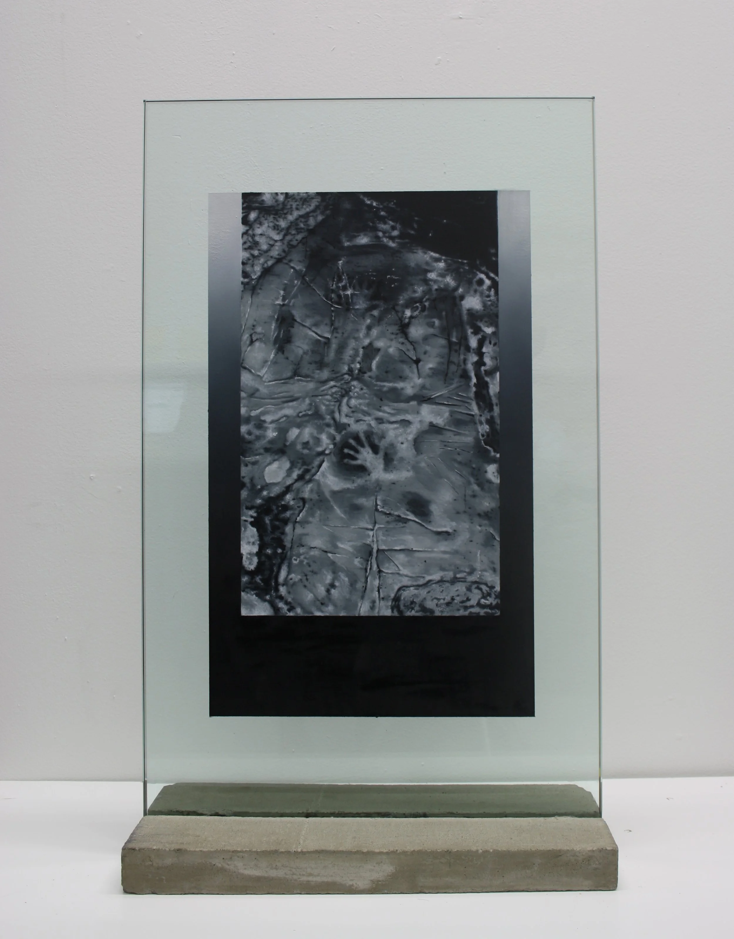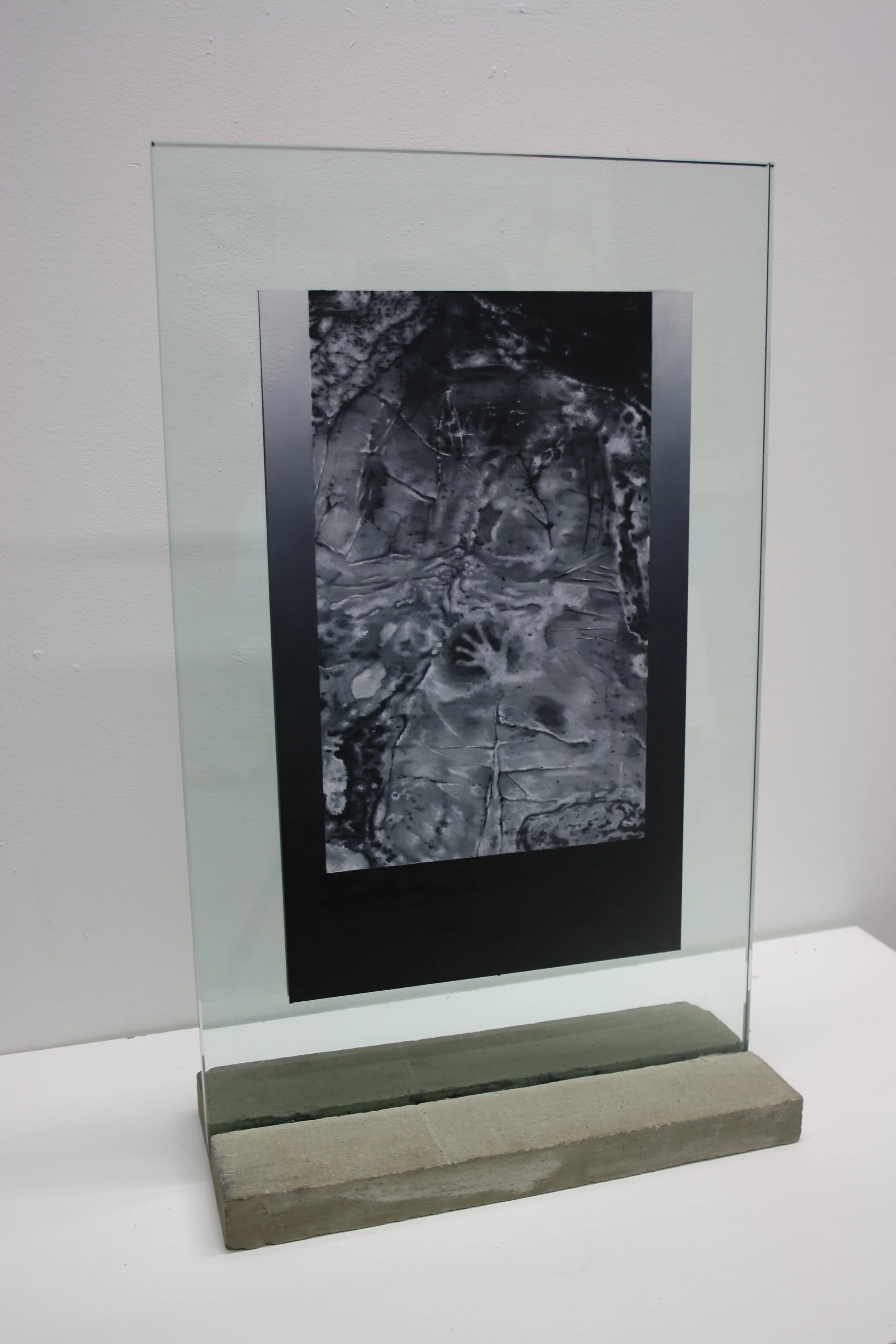 Cave (reverse view), oil on glass with concrete base, 18x30x20", 2019