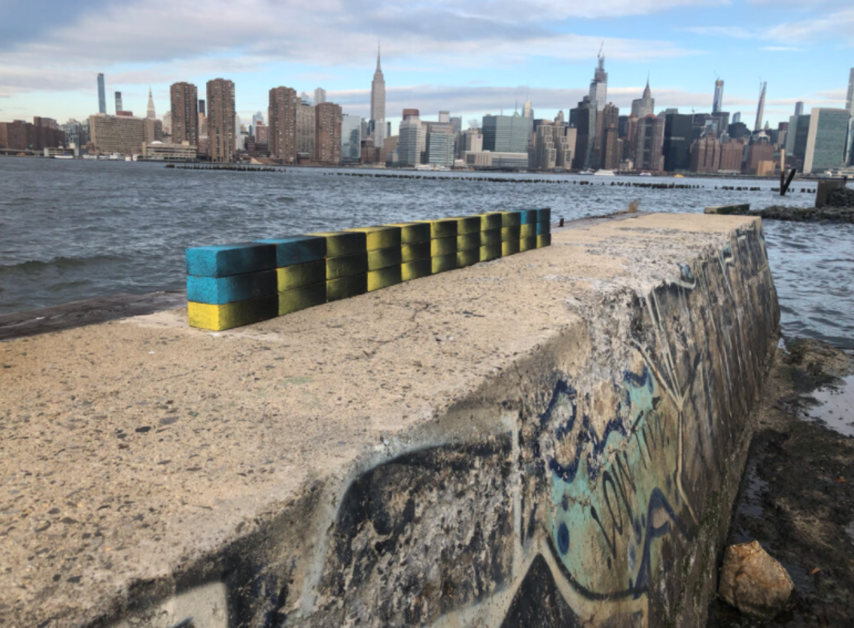 Brick, Yellow, Cerulean, 9x5x4.5”, found granite brick & Spray paint, 2019